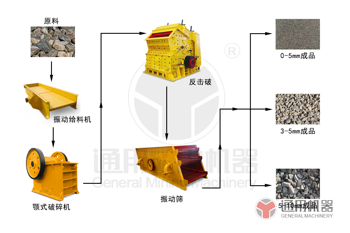 石灰石原料由料台振动给料机输入颚式破碎机进行破碎,将较大的物料破碎至下到工序的进料大小,破碎后的石料由输送带输至中转料仓进行堆码。破碎后的物料通过中转料仓底部给料机输入输送机,然后再送入反击式破碎机进行细碎。符合要求的石料进入后续工序进行筛分清洗,粒度过大的石料返回反击式破碎机再次破碎。破碎后的物料由输送带送入振动筛进行筛分,分选出不同规格的成品石料?;敖?/span>轮式洗砂机进行清洗,去除粉尘,得到高品质的机制砂。