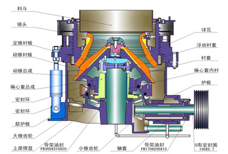 圆锥破碎机主要由机架、定锥总成、动锥总成、弹簧机构、碗型轴架部和传动等部分组成;其辅助部分由电气系统、稀油润滑系统和液压清腔系统组成。