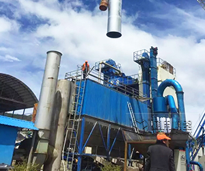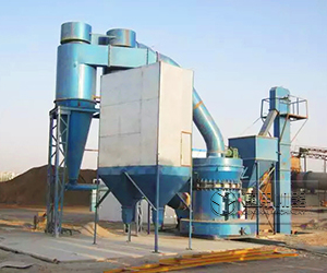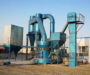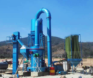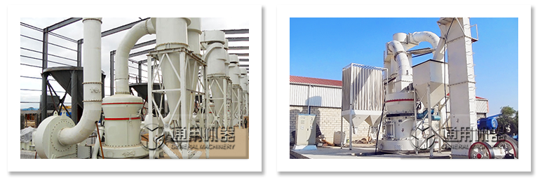 碳酸钙物料经破碎机破碎成小颗粒后,由提升机送入料仓,再通过给料机和倾斜的导料管,将物料均匀地送到转盘上部的散料盘上。磨粉机工作时,磨辊在环道内旋转、滚动。物料在离心作用下散向周边并落入磨腔,在环道内被磨辊冲压、滚辗、研磨。随着高压风机不断的抽吸设备机内部的空气,经多层粉碎后的物料,被带入选粉机,高速旋转的叶轮对其进行筛选,不合格的物料回落重磨,合格的物料则随气流进入旋风集粉器,密度较大尘粒下落,由底部的卸料阀排出即为成品,密度较小的细粉尘则随气流进入除尘器,并粘附在滤袋表面,脉冲阀控制高压气流从滤袋内部瞬间喷射,粘附其上的粉尘则因滤袋的抖动下落,底部的输送机则把两处收集的物料送出进行成品包装。