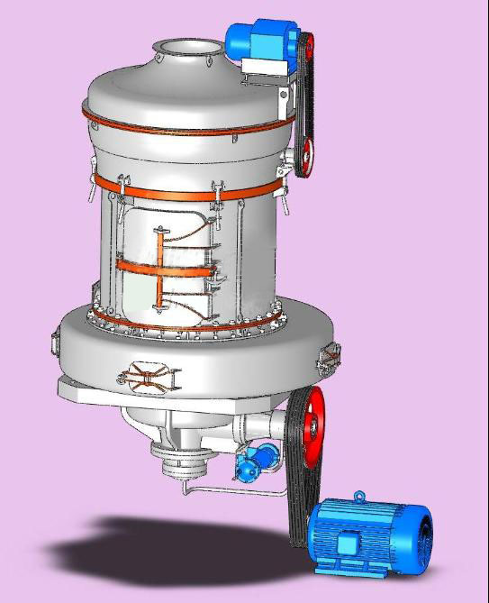 欧版磨粉机的主机工作过程是:通过锥齿轮整体传动装置带动中心轴转动,轴的上端联结着磨辊吊架,架上装有磨辊装置并形成摆动支点。磨辊装置不仅围绕中心轴回转,还围绕着磨环公转,磨辊本身因摩擦作用而自转。磨辊吊架下装有铲刀,其位置处于磨辊下端,铲刀与磨辊同转过程中把 物料抛起喂入磨辊磨环之间,形成垫料层,该料层受磨辊旋转产生向外的离心力(即挤压力)将物料碾碎,由此而达到制粉目的。