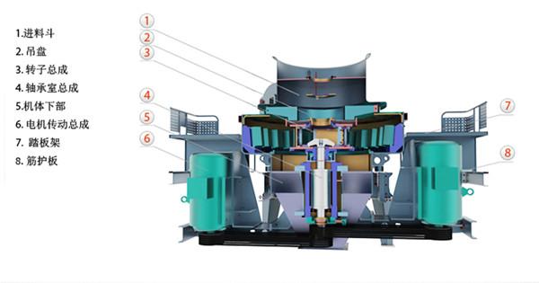 9、叶轮及涡动破碎腔内的物料自衬大幅度减少磨损件费用和维修工作量。在生产过程中,石料能形成保护底层,机身无磨损,经久耐用。