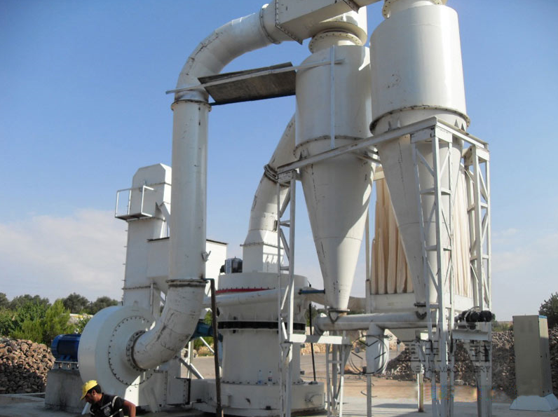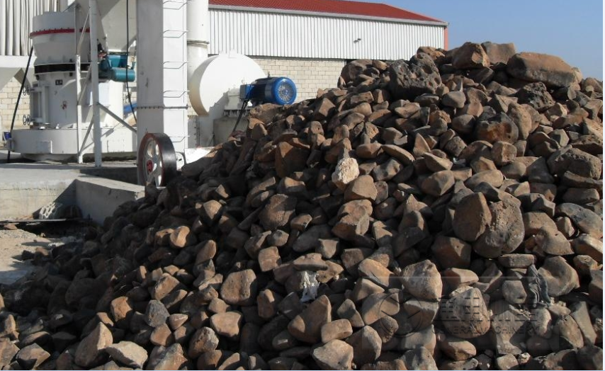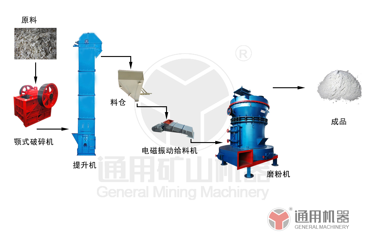 其工艺流程主要包括:大块物料经过破碎机,破碎成小块物料, 经由提升机提升到小料仓,通过电磁振动给料机均匀给料到磨粉机里面。经过磨粉机研磨到200-500目。合格物料被风机吹到磨机上方的分级机,并传送到集粉器里面。由提升机提升到沸腾炉里面,经过煅烧之后,再由提升机提升到成品料仓库,配备双嘴打包机和罐车,最终运送到目的地。
